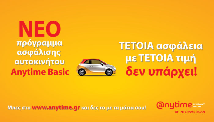 Τέτοια ασφάλεια αυτοκινήτου με τέτοια τιμή, δεν υπάρχει! Δείτε το Anytime Auto Basic στο www.anytime , πάρτε προσφορά και αγοράστε το συμβόλαιό σας πιο γρήγορα και πιο οικονομικά από ποτέ!