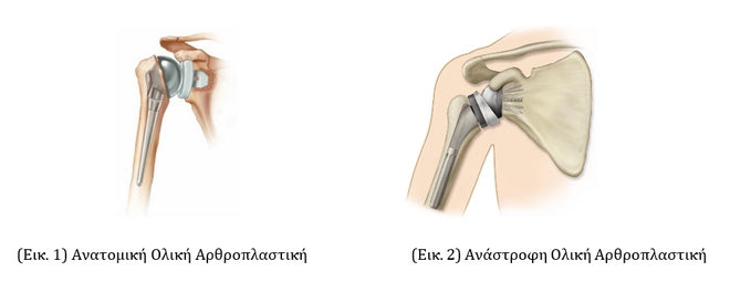 Ανατομική ολική αρθροπλαστική ώμου: Στην ολική αρθροπλαστική ώμου (Εικ. 1) αντικαθίστανται και οι δύο αρθρικές επιφάνειες του ώμου διατηρώντας την ανατομία της άρθρωσης. Στην πλευρά του βραχιονίου τοποθετείται μια μεταλλική ή κεραμική κεφαλή με ή χωρίς στυλεό και στην πλευρά της ωμογλήνης, η οποία αποτελεί το κοίλο τμήμα της άρθρωσης, τοποθετείται μια νέα αρθρική επιφάνεια είτε από μέταλλο, είτε συνηθέστερα από πολυαιθυλένιο.