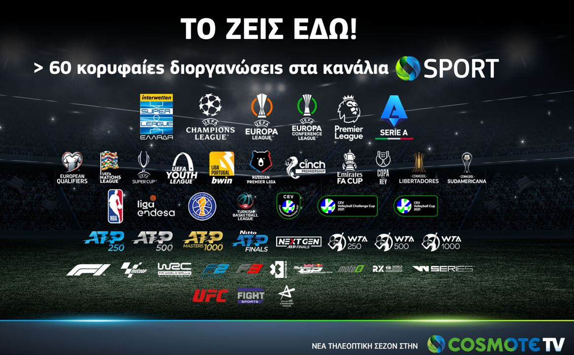 Το πιο πλούσιο αθλητικό θέαμα θα προσφέρει η COSMOTETV στους συνδρομητές της, από τη νέα τηλεοπτική σεζόν. Περισσότερες από 60 κορυφαίες διοργανώσεις σε ποδόσφαιρο, μπάσκετ, τένις, μηχανοκίνητα και άλλα δημοφιλή αθλήματα, θα προσφέρουν αμέτρητες συγκινήσεις, μέσα από ένα πρόγραμμα που περιλαμβάνει πάνω από 8.000ώρεςlive μεταδόσεων. Κριστιάνο Ρονάλντο, Μοχάμεντ Σαλάχ, Γιάννης Αντετοκούνμπο, Λεμπρόν Τζέιμς, Στέφανος Τσιτσιπάς, Μαρία Σάκκαρη, Λιούις Χάμιλτον, Μαξ Φερστάπεν, Σεμπαστιάν Οζιέ, Έλφιν Έβανς, Φάμπιο Κουαρταραρό, Γιόχαν Ζάρκο είναι έτοιμοι για μεγάλες μάχες και η δημοσιογραφική ομάδα των καναλιών COSMOTESPORT θα βρίσκεται σε κάθε γήπεδο και σε κάθε πίστα για να τις μεταδώσει.
