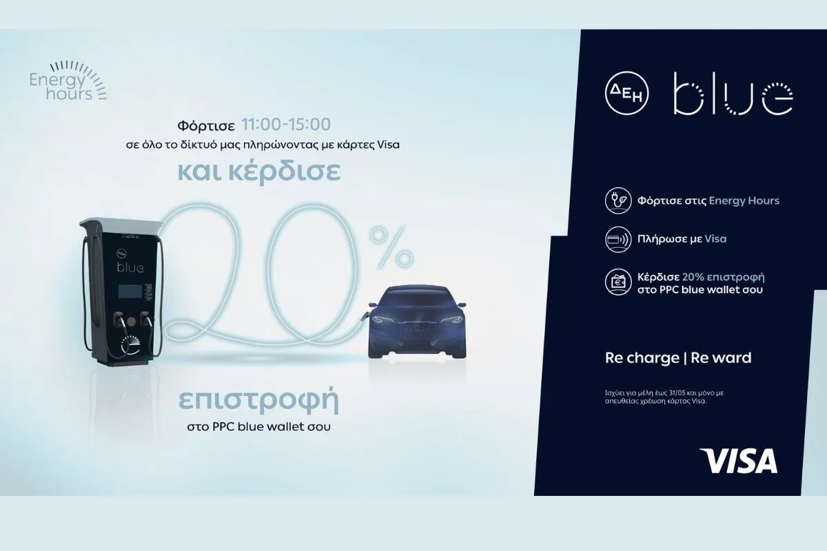 ΔΕΗ blue: 20% επιστροφή, για φόρτιση ηλεκτρικών οχημάτων στις μεσημεριανές «Energy Hours» σε συνεργασία με τη Visa