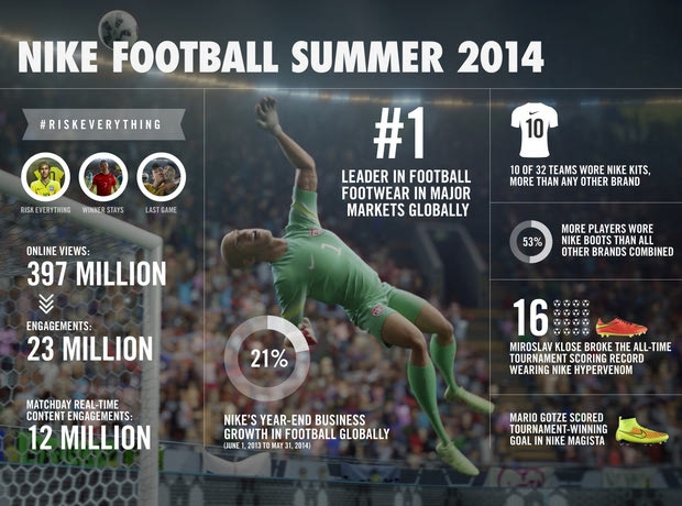 Oι παραπάνω αριθμοί -που δεν έχουν προηγούμενο- φανερώνουν το μοναδικό βαθμό δέσμευσης των χρηστών με τη μάρκα. Παράλληλα με την κατά 21% αύξηση της επιχειρηματικής δραστηριότητας της Nike Football από τον Ιούνιο του 2013 μέχρι τον Μάιο 2014 έως και τη διεξαγωγή του Παγκοσμίου Κυπέλλου, τα στοιχεία αποδεικνύουν ότι η Nike κατέχει την ηγετική θέση στον τομέα ποδοσφαιρικών παπουτσιών και ρουχισμού παγκοσμίως.