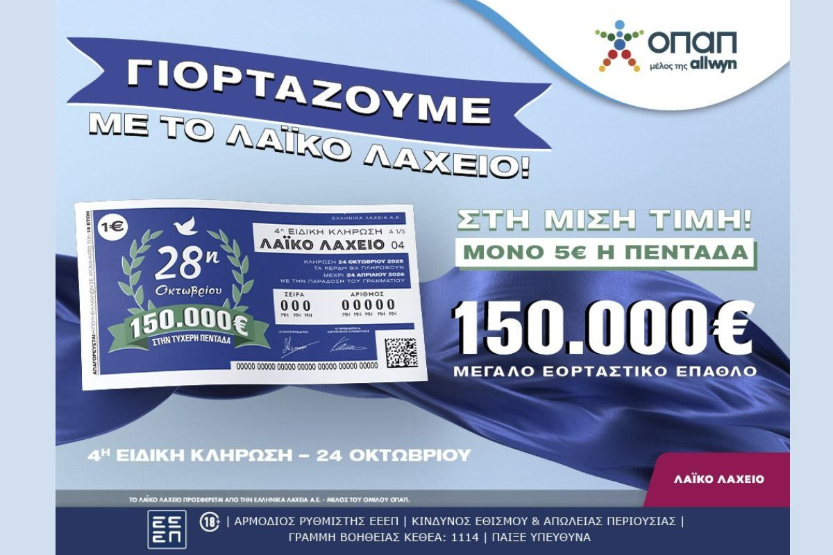 Αντίστροφα μετράει ο χρόνος για την ειδική κλήρωση της 28ης Οκτωβρίου του Λαϊκού Λαχείου, με το παιχνίδι του ΟΠΑΠ να μοιράζει μέχρι και 150.000 ευρώ στην τυχερή πεντάδα λίγες ημέρες νωρίτερα, την Παρασκευή 24 Οκτωβρίου. Το Λαϊκό Λαχείο συμμετέχει για πρώτη φορά στην εορτή της 28ης Οκτωβρίου, με τους παίκτες να προμηθεύονται τους λαχνούς τους, μέσω του δικτύου καταστημάτων ΟΠΑΠ και των λαχειοπωλών σε όλη την Ελλάδα, στη μισή τιμή από την κανονική κλήρωση, δηλαδή με 5 ευρώ για την πεντάδα και 1 ευρώ για κάθε λαχνό.