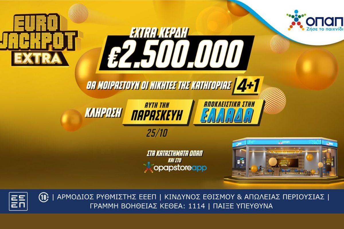 Το Eurojackpot Extra θα μοιράσει επιπλέον 2,5 εκατ. ευρώ στους νικητές της κατηγορίας 4+1 και στην κλήρωση της Παρασκευής, αποκλειστικά για τους παίκτες στην Ελλάδα.