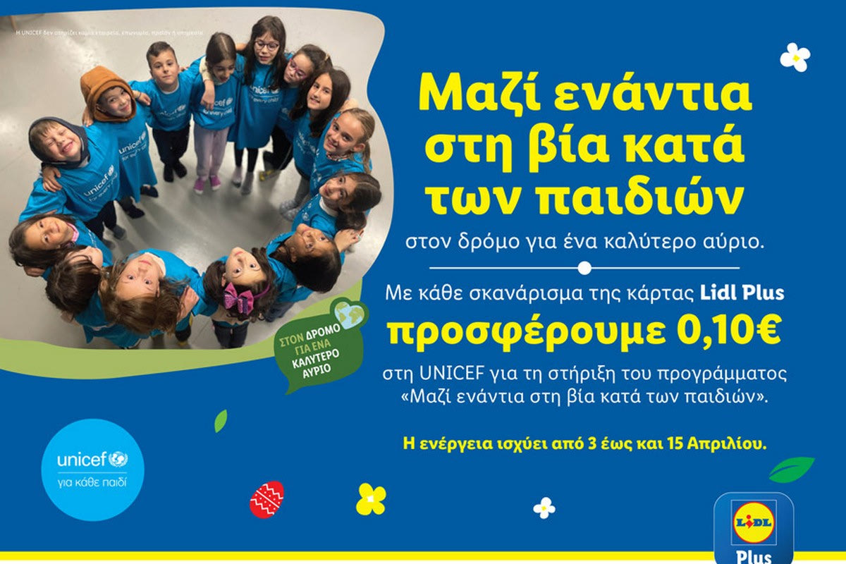 Από τις 3 έως και τις 15 Απριλίου με κάθε σκανάρισμα της ψηφιακής κάρτας Lidl Plus, η Lidl Ελλάς προσφέρει 0,10€ στη UNICEF για τη στήριξη του προγράμματος «Μαζί ενάντια στη βία κατά των παιδιών».