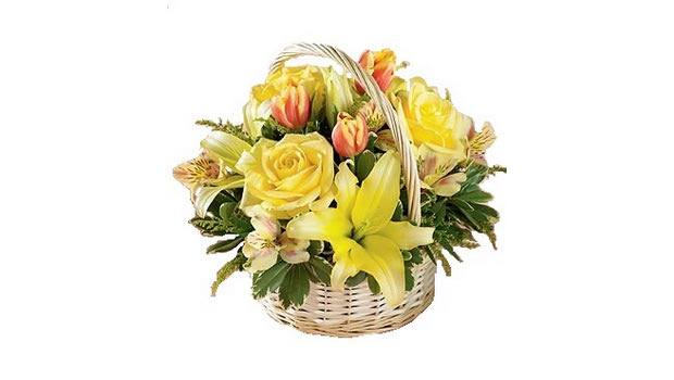 Καλαθάκι με ανοιξιάτικα λουλούδια σε κίτρινη φωτεινή διάθεση για να ευχηθείτε και να δωρίσετε στους αγαπημένους σας. Τα άνθη που συνθέτουν το καλάθι είναι κίτρινα τριαντάφυλλα και λίλιουμ, δίχρωμες τουλίπες, άνθη εποχής και πρασινάδες. Υπάρχει δυνατότητα να γίνει και σε άλλες αποχρώσεις, σημειώστε την επιλογή σας κατά την διάρκεια της παραγγελία σας.