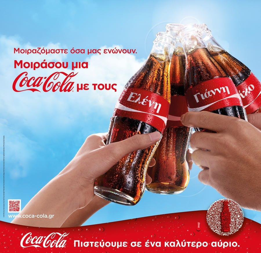 Η καμπάνια έχει σκοπό να εμπνεύσει τους καταναλωτές να μοιραστούν στιγμές απόλαυσης με τους ανθρώπους που αγαπάνε, δείχνοντάς μας πως το να μοιράζεσαι είναι ένας λόγος για να πιστεύουμε σε ένα καλύτερο αύριο. Οι συσκευασίες με τα ονόματα αναμένεται να μας συναρπάσουν αυτό το καλοκαίρι, να πυροδοτήσουν συζητήσεις, και να ενθουσιάσουν τόσο τους εφήβους, όσο και τους μεγαλύτερους σε ηλικία καταναλωτές. Στην Ελλάδα, οι συσκευασίες φιλοξενούν όχι μόνο τα πιο δημοφιλή ονόματα, αλλά και παιχνιδιάρικες λέξεις και υποκοριστικά που θα φιγουράρουν αντί του λογοτύπου της Coca-Cola.
