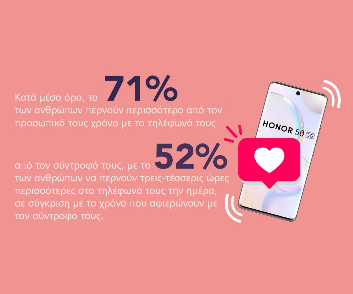 Ταυτόχρονα, μέσω ενός Infographic, η HONOR μοιράζεται μια πρόσφατη έρευνα* τρίτων που διεξήχθη σε 2.000 χρήστες smartphone που ζουν με το σύντροφο τους, για να διαπιστώσει πόσο επηρέασε τη σχέση τους η χρήση του smartphone.