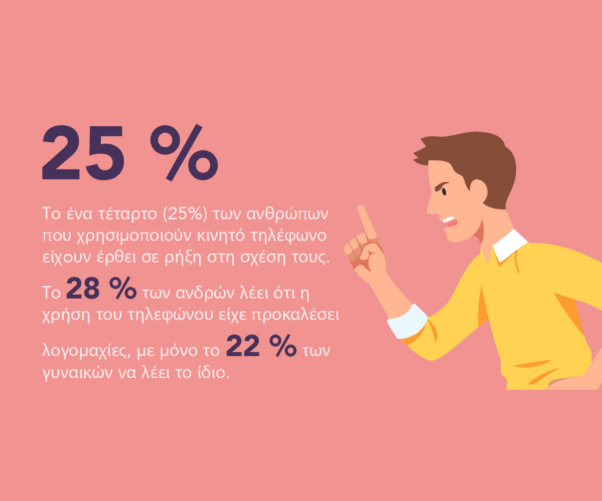 - Το 28% των ανδρών λέει ότι η χρήση του τηλεφώνου είχε προκαλέσει λογομαχίες, με μόνο το 22% των γυναικών να λέει το ίδιο