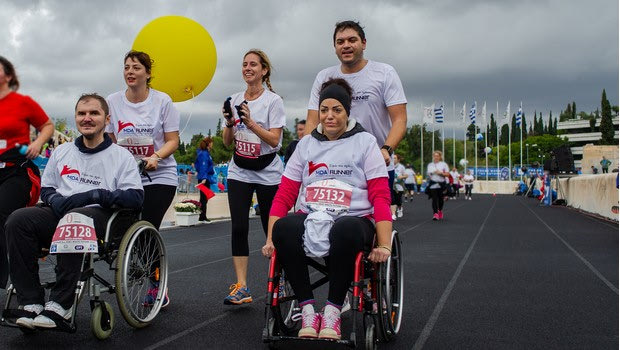 Οι εθελοντές δρομείς της ΝΝ Ηellas έστειλαν το δικό τους μήνυμα αλληλεγγύης, συνοδεύοντας τα μέλη του ΜDA Eλλάς με αναπηρικά αμαξίδια στη διαδρομή των 10χλμ και των 5χλμ αντίστοιχα.