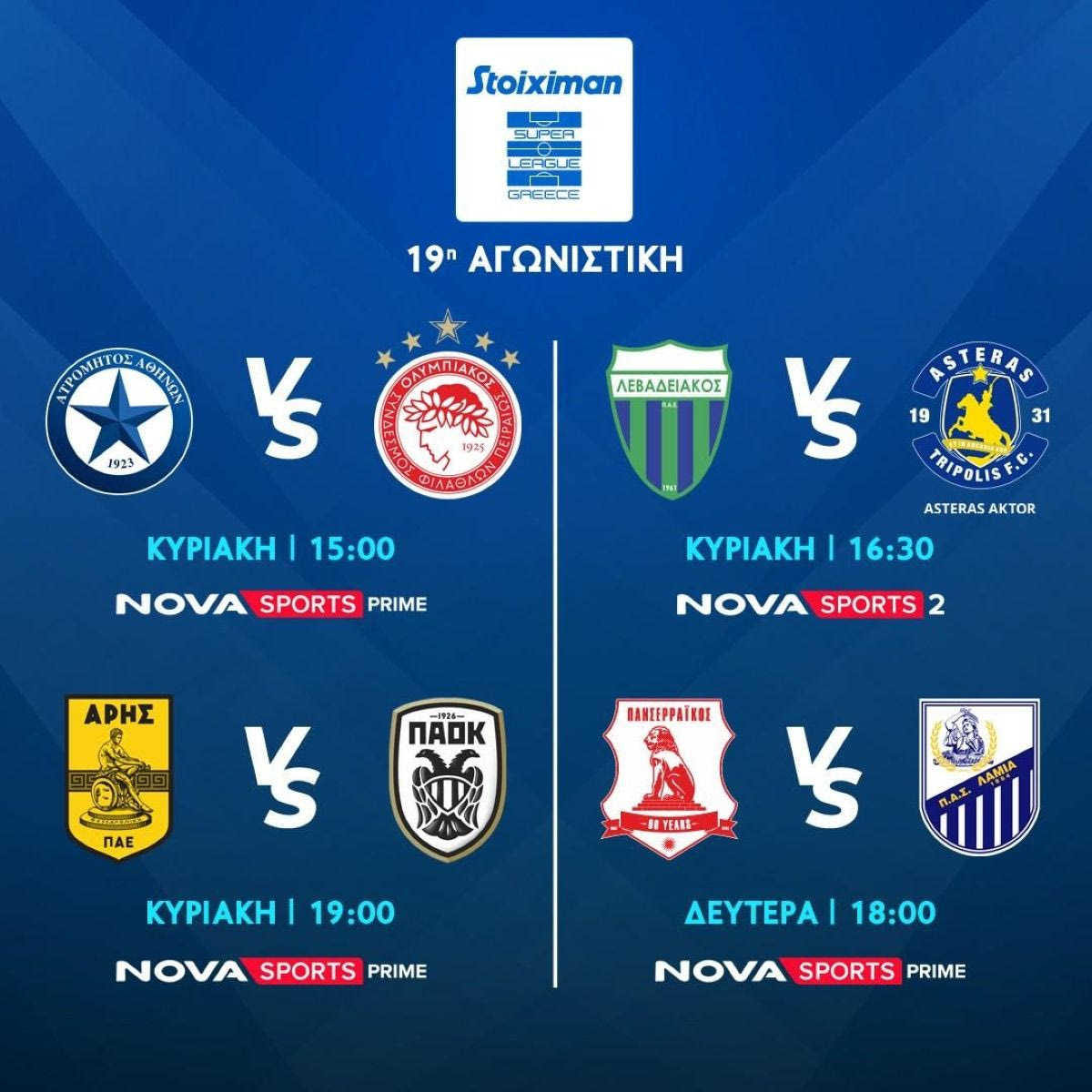 Η Stoiximan Super League, συνεχίζεται με την 19η αγωνιστική με το «El Clasico» της Θεσσαλονίκης, Άρης – ΠΑΟΚ (19/1, 19:00) και τους αγώνες Ατρόμητος – Ολυμπιακός (19/1, 15:00), Λεβαδειακός – Asteras AKTOR (19/1, 16:30) και Πανσερραϊκός – Λαμία (20/1, 18:00) που θα μεταδοθούν από τα κανάλια Novasports. Στα κανάλια Cosmote Sport θα προβληθεί το αθηναϊκό ντέρμπι Παναθηναϊκός – ΑΕΚ (19/1, 20:30), καθώς και οι αγώνες Παναιτωλικός – ΟΦΗ (19/1, 17:00), Athens Kallithea FC – Βόλος ΝΠΣ (18/1, 17:00). Οι αγώνες του ελληνικού πρωταθλήματος θα πλαισιωθούν στο Novasports και με την αγαπημένη εκπομπή των φιλάθλων «Η Ώρα των Πρωταθλητών» με τους Γιαννίκο Δούσκα, Λίλα Κουντουριώτη, Χριστίνα Κομίνη αλλά και με τον «Monday Football Club» με τους Ντέμη Νικολαϊδη και Γιάννη Πάγκο.