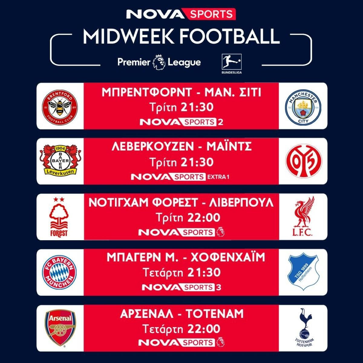Στην Premier League, το κορυφαίο πρωτάθλημα στον η δράση είναι non stop με διπλή αγωνιστική με τους αγώνες που ξεχωρίζουν να είναι Νότιγχαμ Φόρεστ – Λίβερπουλ (14/1, 22:00), Άρσεναλ – Τότεναμ (15/1, 22:00), Μπρέντφορντ – Μάντσεστερ Σίτι (14/1, 21:30) για την 21η αγωνιστική και Μπρέντφορντ – Λίβερπουλ (18/1, 17:00), Άρσεναλ – Άστον Βίλα (18/1, 19:30), Νότιγχαμ – Σαουθάμπτον (19/1, 16:00) και Ίπσουιτς – Μάντσεστερ Σίτι (19/1, 18:30). Η Premier League θα πλαισιωθεί με τις εκπομπές «Premier League Kick Off» και «Premier League The Show» με τον Άγγελο Στυλιάδη.