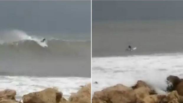 Στον Μάραθο Μεσσηνίας τα κύματα έχουν φτάσει τα 10 μετρα, αλλά αυτό δεν εμπόδισε εναν παράτολμο σέρφερ να προσπαθήσει να δαμάσει τα κύματα.