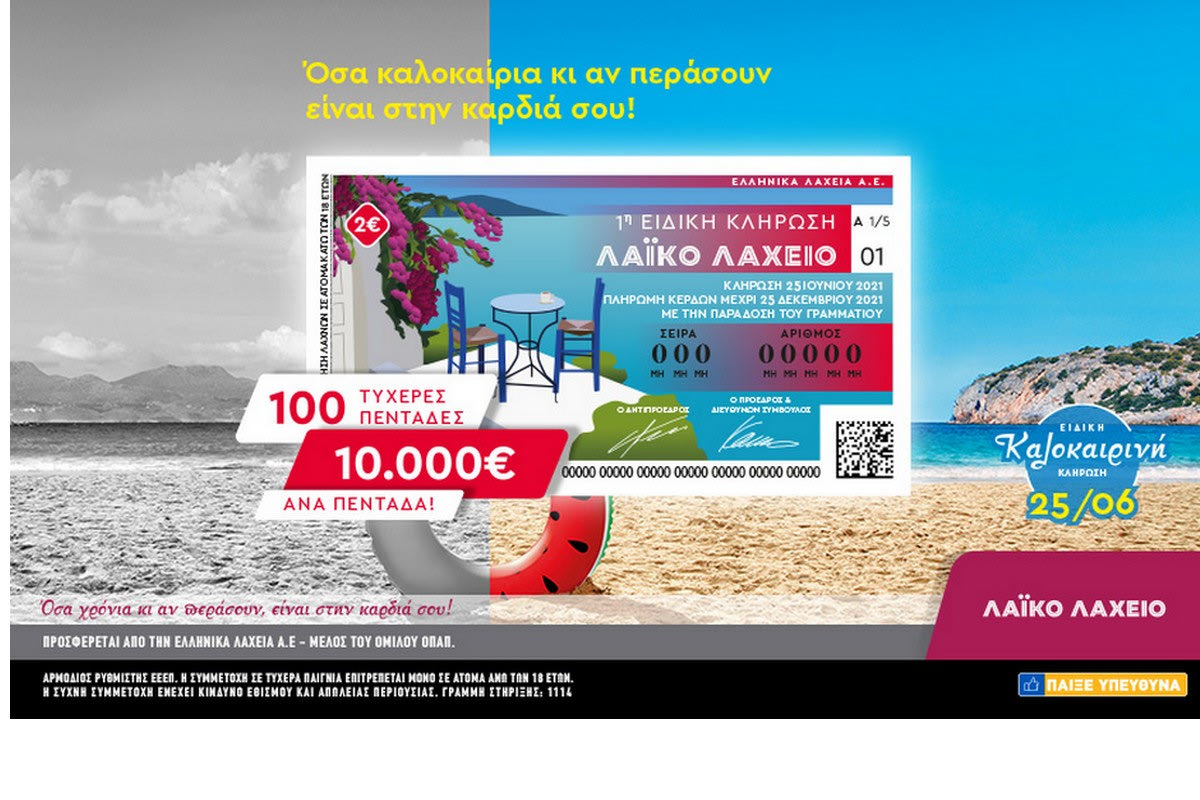 Το Λαϊκό Λαχείο μοιράζει 10.000 ευρώ σε 100 τυχερούς– Ειδική καλοκαιρινή κλήρωση την Παρασκευή 25 Ιουνίου
