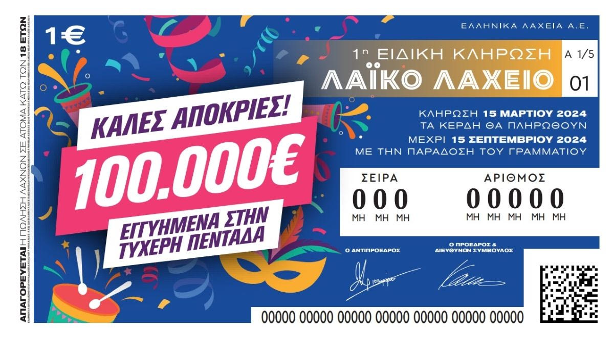 Στον ρυθμό του Καρναβαλιού κινείται το Λαϊκό Λαχείο, με την ειδική αποκριάτικη κλήρωση αύριο, 15 Μαρτίου, να μοιράζει εγγυημένα 100.000 ευρώ στην τυχερή πεντάδα.