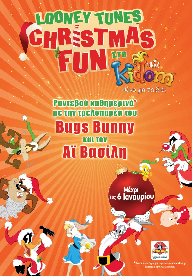 Το Kidom του Allou! Fun Park γιορτάζει τα Χριστούγεννα με τους πιο αγαπημένους ήρωες των παιδιών αλλά και των μεγάλων, τα Looney Tunes! Ο Bugs Bunny, ο Duffy Dack, ο Tweety, ο Sylvestro, το Coyote, το Beep- beep και ο Taz θα εμφανίζονται* αποκλειστικά στο Kidom για να παίξουν και να φωτογραφηθούν με τα παιδιά από τις 14.12.2013 έως τις 6.1.2014.