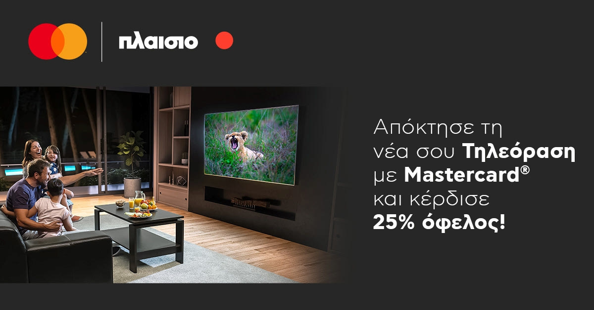 Με αγορά νέας τηλεόρασης με κάρτα Mastercard® από τα καταστήματα Πλαίσιο, οι καταναλωτές κερδίζουν το 25% της αξίας της για την επόμενη αγορά τους