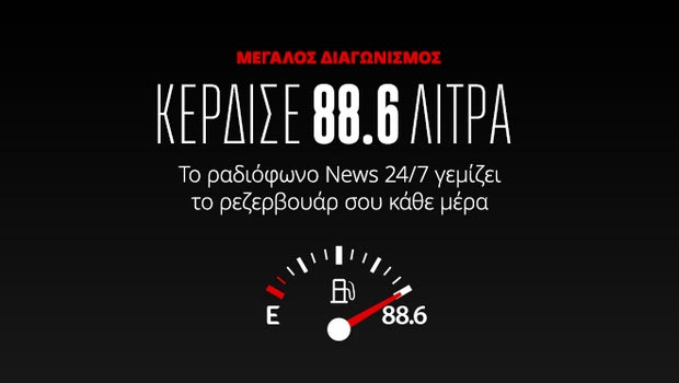 Κέρδισε κι εσύ τα 88,6 λίτρα καύσιμα κάθε ημέρα! Το ραδιόφωνο News 24/7 στους 88,6 σε καλεί να πάρεις μέρος στο μεγάλο διαγωνισμό όλο το μήνα και να είσαι εσύ αυτός ή αυτή που θα γεμίσει το ρεζερβουάρ με τα καύσιμα της ΕΚΟ! Δήλωσε συμμετοχή, βάλε 88,6 και περίμενε να ακούσεις το όνομά σου!