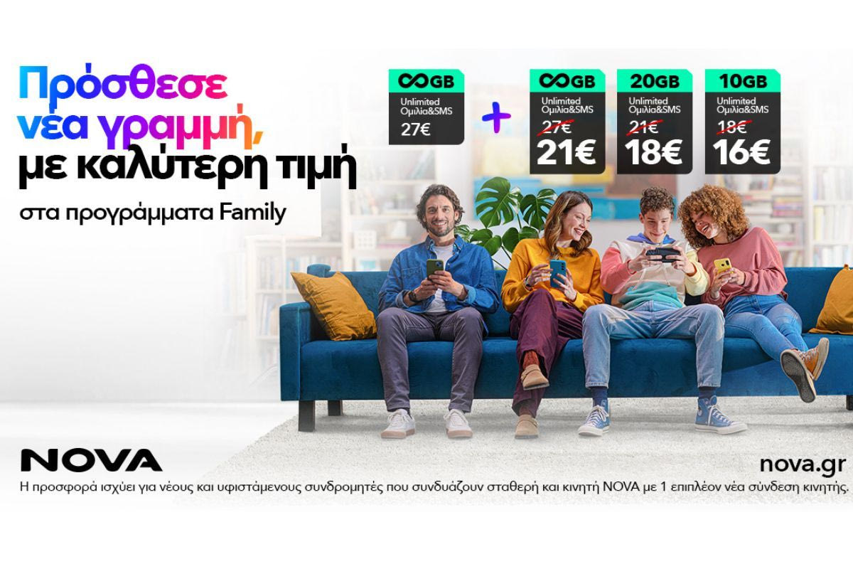 Τα νέα προγράμματα Nova Family είναι τώρα διαθέσιμα τόσο για νέους όσο και για υφιστάμενους πελάτες που συνδυάζουν σταθερή και κινητή Nova με 1 επιπλέον σύνδεση κινητής. Για να μάθετε περισσότερα ή για να εγγραφείτε, επισκεφτείτε το nova.gr ή το πλησιέστερο κατάστημα Nova.