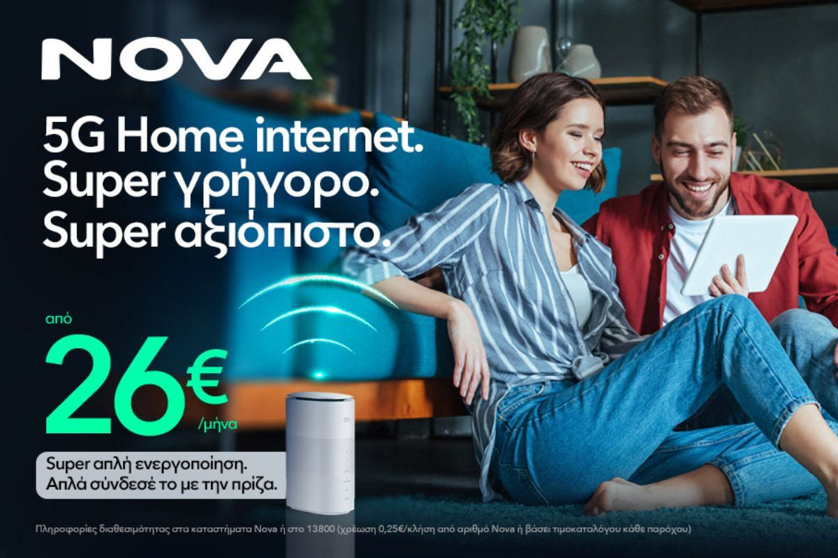 Με το 5G Home Internet, η Nova προσφέρει μια νέα, προηγμένη λύση internet και σταθερής τηλεφωνίας, που είναι λιγότερο επιρρεπής σε βλάβες. Η υπηρεσία ενεργοποιείται άμεσα, χρησιμοποιώντας ένα plug ‘n play Wi-Fi 6 router με εύκολη και γρήγορη εγκατάσταση. Οι χρήστες έχουν πρόσβαση στο internet από την πρώτη μόλις ημέρα της εγκατάστασης.