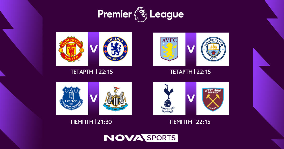 Οι συνδρομητές Novasports θα έχουν την ευκαιρία να απολαύσουν μοναδικές συγκινήσεις και από τα ευρωπαϊκά γήπεδα! Στην Premier League, το κορυφαίο πρωτάθλημα στον κόσμο που παίζει αποκλειστικά στο Novasports και με τους 380 αγώνες LIVE, το θέαμα θα είναι….διπλό αυτό την εβδομάδα, καθώς υπάρχει εμβόλιμη αγωνιστική (15η) όπου δεσπόζει το ντέρμπι Μάντσεστερ Γιουνάιτεντ – Τσέλσι (6/12, 22:15) αλλά και οι αγώνες Λούτον – Άρσεναλ (5/12, 22:15) και Άστον Βίλα – Μάντσεστερ Σίτι (6/12, 22:15). Παράλληλα, για την 16η αγωνιστική οι συνδρομητές θα απολαύσουν όλα τα ματς με το ενδιαφέρον να στρέφεται στα παιχνίδια Κρίσταλ Πάλας – Λίβερπουλ (9/12, 14:30), Άστον Βίλα – Άρσεναλ (9/12, 19:30), Λούτον – Μάντσεστερ Σίτι (10/12, 16:00)