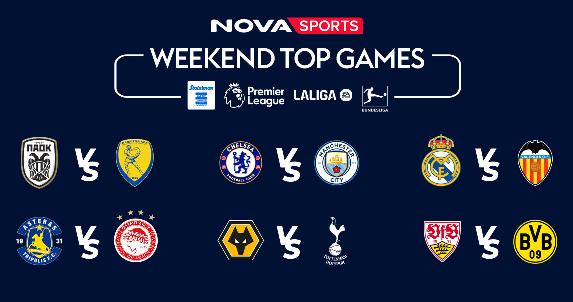 Οι συνδρομητές Novasports θα έχουν την ευκαιρία να απολαύσουν μοναδικές συγκινήσεις και από τα ευρωπαϊκά γήπεδα! Στην Premier League, το κορυφαίο πρωτάθλημα στον κόσμο που παίζει αποκλειστικά στο Novasports και με τους 380 αγώνες LIVE, δεσπόζει το ντέρμπι Τσέλσι – Μάντσεστερ Σίτι, ενώ στη Bundesliga τα φώτα στρέφονται στους αγώναες Μπάγερν Μονάχου-Χάιντενχαϊμ και Στουτγκάρδη – Ντόρτμουντ. Στην LaLiga EA Sports ξεχωρίζουν οι αγώνες Ρεάλ Μαδρίτης – Βαλένθια, Μπαρτσελόνα – Αλαβές, Ατλέτικο Μαδρίτης – Βιγιαρεάλ και Σεβίλλη – Μπέτις ενώ στη Ligue 1 θα αναμετρηθούν Λανς – Μαρσέιγ και Ρενς – Παρί Σεν Ζερμέν.