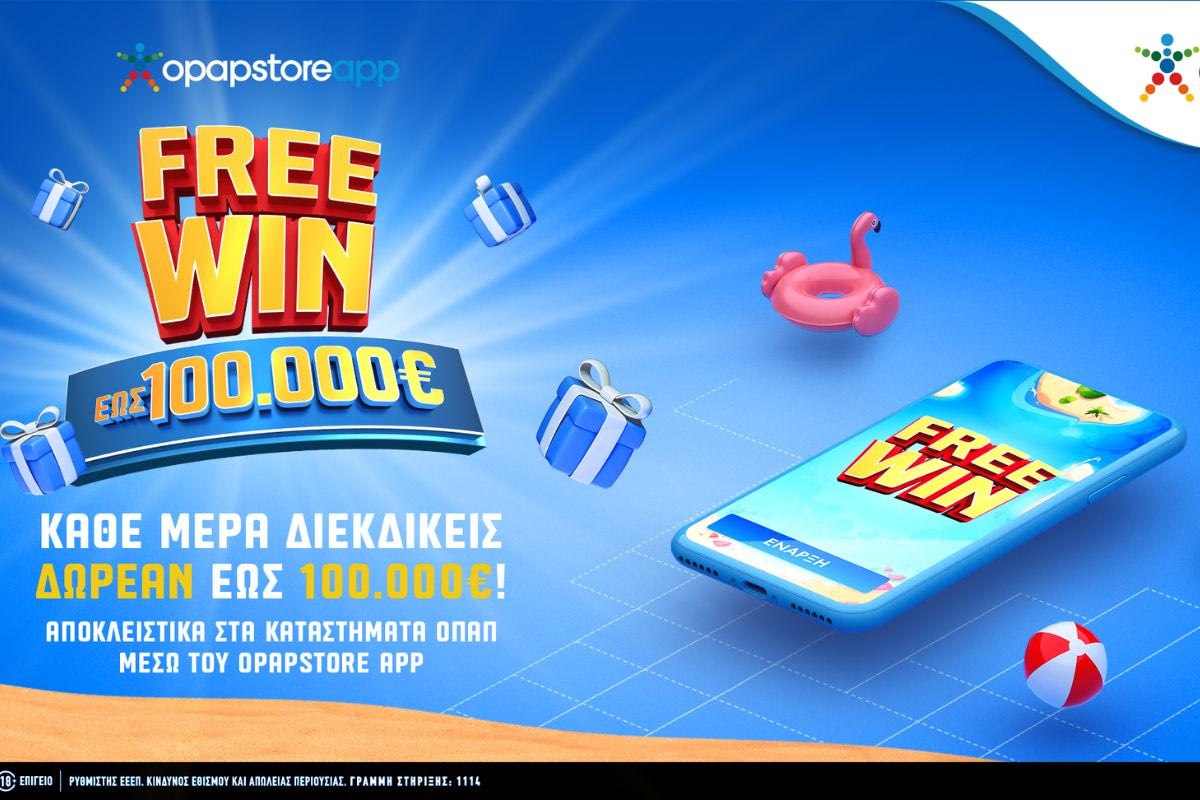 Το νέο δωρεάν FREEWIN*, που σου δίνει την ευκαιρία να κερδίσεις έως και 100.000 ευρώ κάθε ημέρα, είναι γεγονός. Μέσα από το OPAP Store App μπαίνεις κι εσύ στον μοναδικό κόσμο του FREEWIN και οι καθημερινές σου αποφάσεις μπορούν να σε οδηγήσουν σε μεγάλα κέρδη.