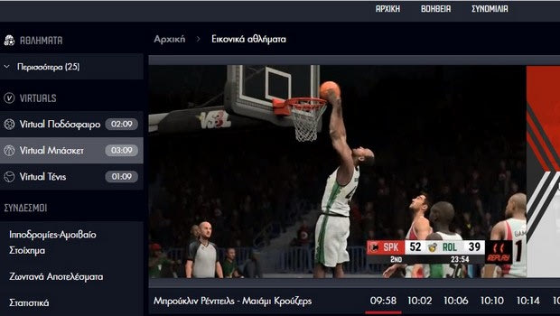 -Στο Virtual Μπάσκετ η δράση έχει άρωμα NBA. Αγωνίζονται 16 από τις καλύτερες ομάδες και οι παίκτες μπορούν να ποντάρουν στις αγορές Νικητής Αγώνα, Χάντικαπ, Σύνολο Πόντων, Πόντοι γηπεδούχου και φιλοξενούμενης ομάδας, αλλά και να ενημερωθούν για τα αποτελέσματα, τις βαθμολογίες και άλλες πληροφορίες σχετικές με τους αγώνες.