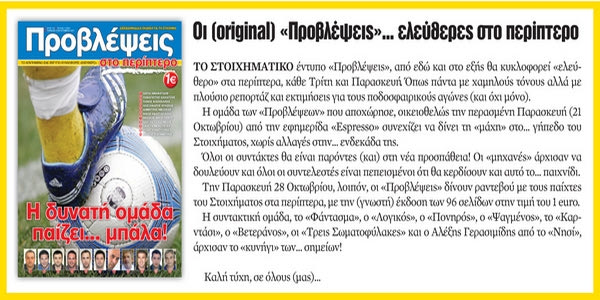 «ΠΡΟΒΛΕΨΕΙΣ στο περίπτερο...» Κάθε Τρίτη και Παρασκευή ΜΟΝΟ με 1 euro. Η συντακτική ομάδα των«Προβλέψεων» κουβαλώντας δεκαετή εμπειρία στα στοιχηματικά δρώμενα έκανε το μεγάλο βήμα: Εκδίδει το περιοδικό αυτόνομο με ελκυστική τιμή για το αναγνωστικό κοινό, λαμβάνοντας υπόψη την δύσκολη οικονομική συγκυρία.