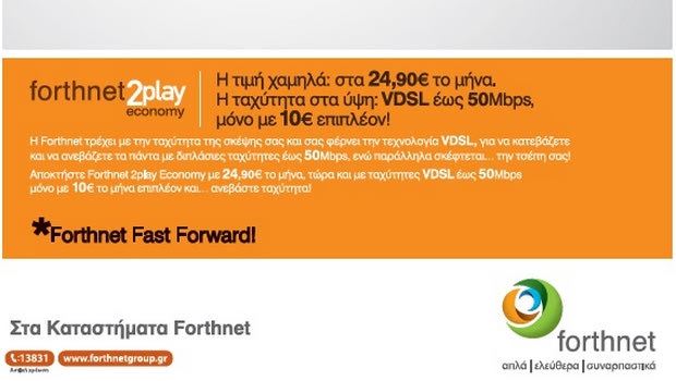 Οι τιμές χαμηλά: Forthnet ADSL με 17,90€ & Forthnet 2play Economy με 24,90€, η ταχύτητα στα ύψη: Mε VDSL έως 50Mbps, μόνο με 10€ επιπλέον, το μήνα!