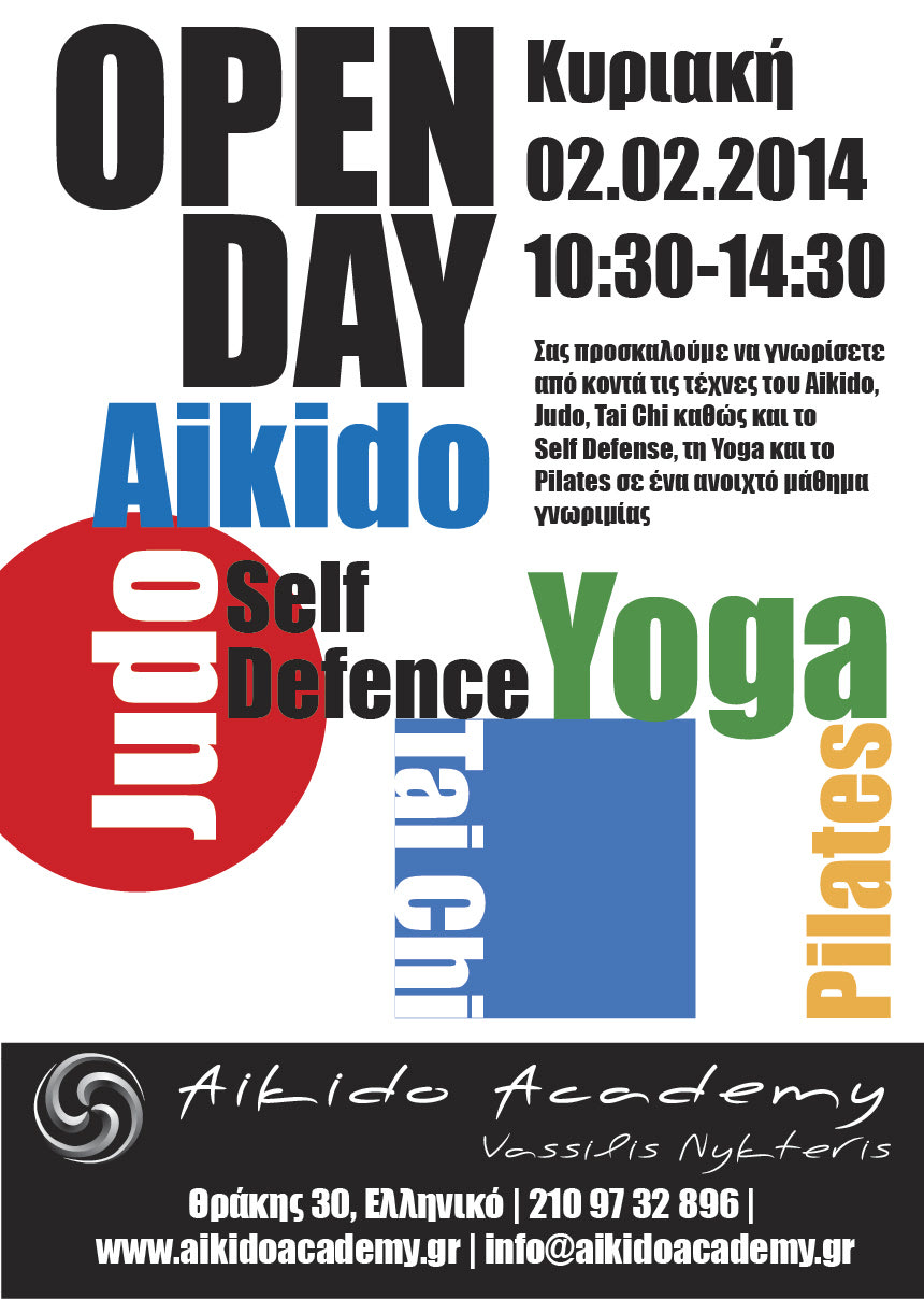Προσκαλούμε λοιπόν όλους εσάς και τα παιδιά σας να χαρείτε και να μοιραστείτε μαζί μας τα οφέλη των τεχνών μας (Aikido, Judo, Tai Chi, καθώς και τα Self Defense, Yoga, Pilates) σε μια από τις μεγαλύτερες σχολές πολεμικών τεχνών στην Ευρώπη.