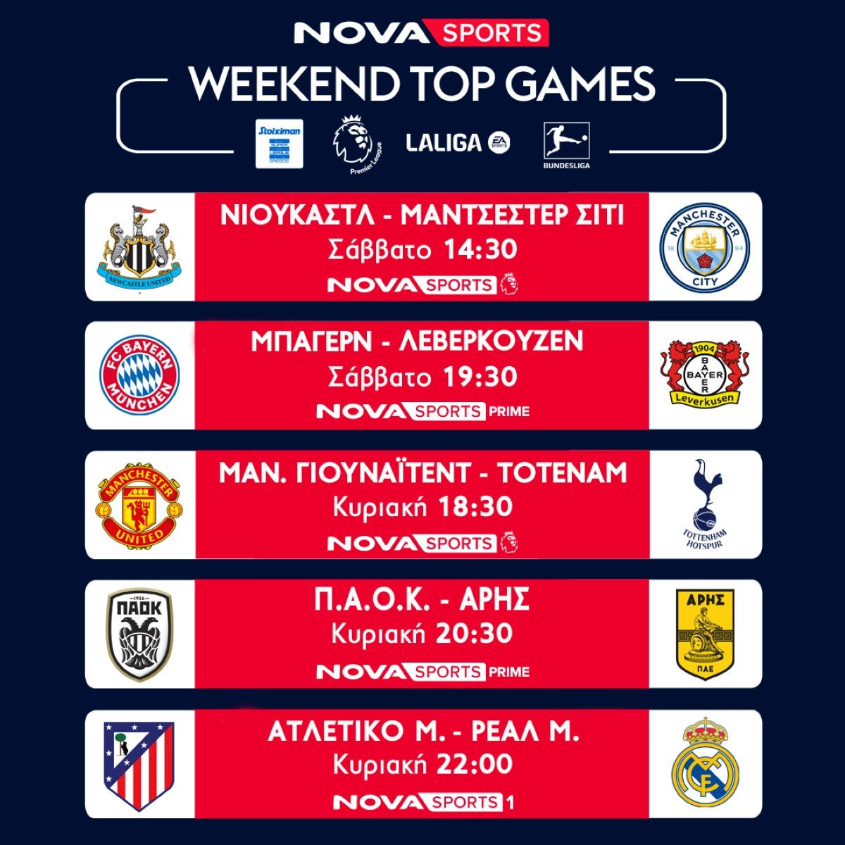 ΠΑΟΚ – Άρης, Μάντσεστερ Γιουνάιτεντ – Τότεναμ, Ατλέτικο Μαδρίτης – Ρεάλ Μαδρίτης, Μπάγερν – Λεβερκούζεν, τζάμπολ με Άρη στο EuroCup στα κανάλια Novasports & UEFA Europa League με Γαλατασαράι – ΠΑΟΚ, Λιόν – Ολυμπιακός και το ντέρμπι ΑΕΚ – Παναθηναϊκός στα κανάλια Cosmote Sport!