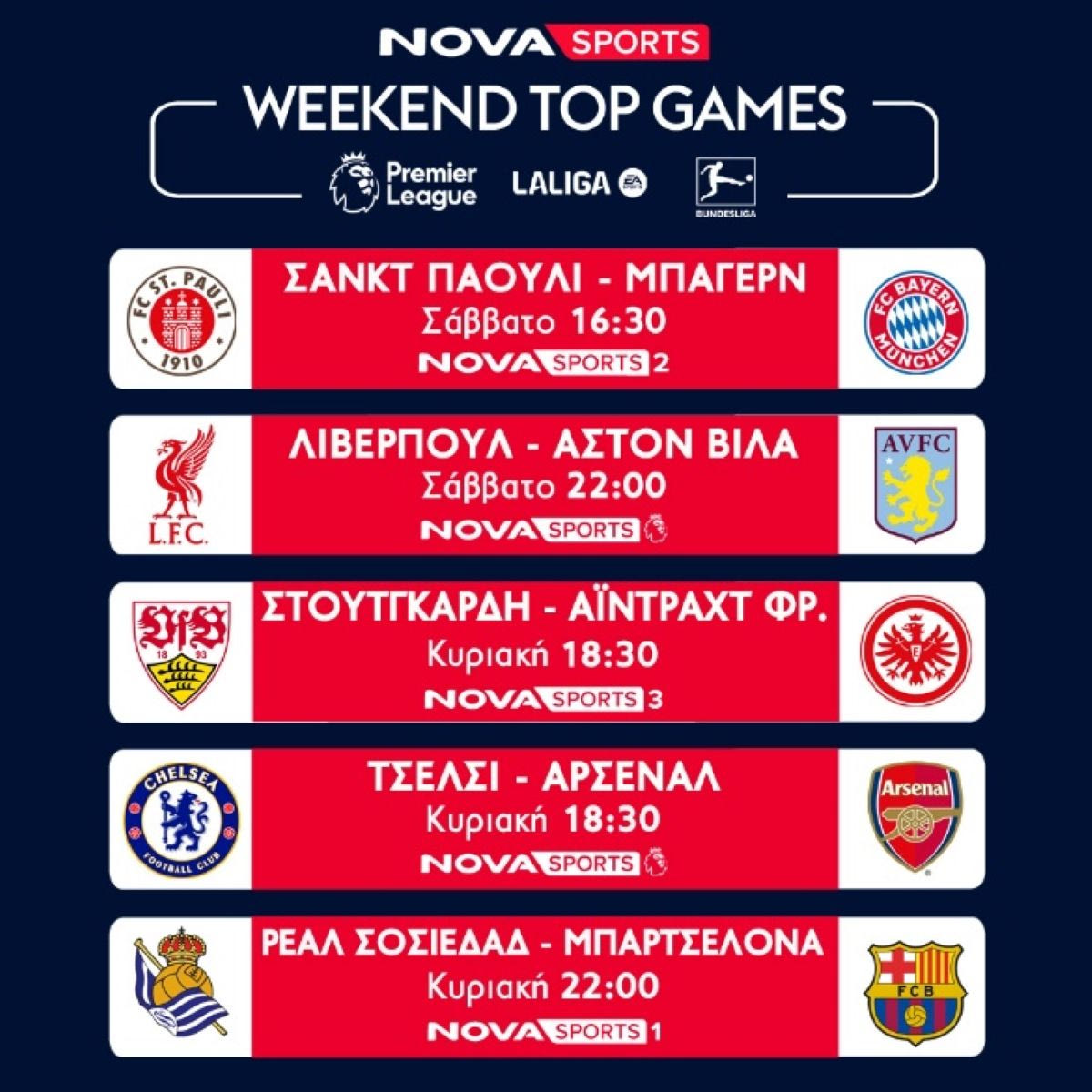 Στην Premier League, το κορυφαίο πρωτάθλημα στον κόσμο με τους 380 αγώνες LIVE και με τη φωνή του Χρήστου Σωτηρακόπουλου,, ξεχωρίζει στα κανάλια Novasports, το ντέρμπι Τσέλσι – Άρσεναλ (10/11, 18:30), καθώς και οι αγώνες Μπράιτον-Μάντσεστερ Σίτι (9/11, 19:30), Λίβερπουλ – Άστον Βίλα (9/11, 22:00), Μάντσεστερ Γιουνάιτεντ-Λέστερ (10/11, 16:00). Η Premier League θα πλαισιωθεί με τις εκπομπές «Premier League Kick Off» και «Premier League The Show» με τον Άγγελο Στυλιάδη.