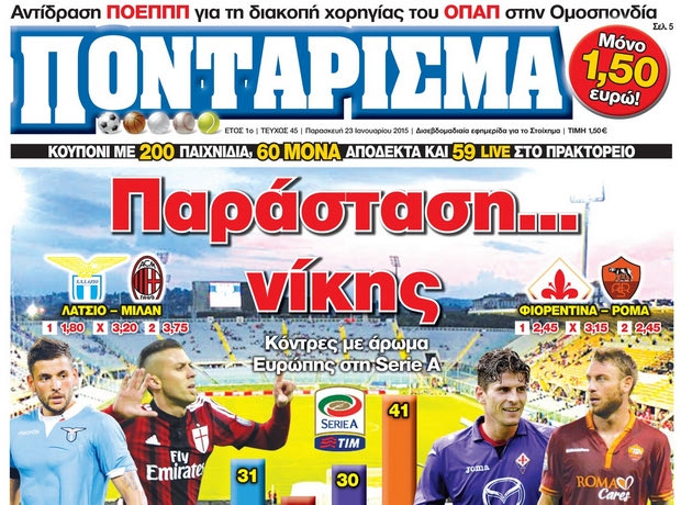 Το «ΠΟΝΤΑΡΙΣΜΑ», που κυκλοφορεί την Παρασκευή 23 Ιανουαρίου, προσφέρει όλη την ειδησεογραφία και τα στατιστικά για τα πρωταθλήματα του κουπονιού, έχοντας ανοιχτή γραμμή με 40 ανταποκριτές απ' όλο τον κόσμο.