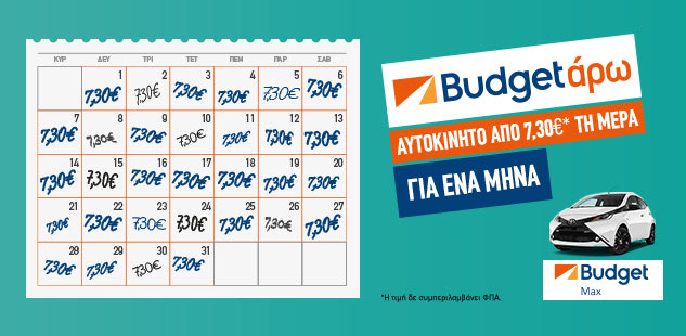 Θέλεις και εσύ να έχεις αυτοκίνητο για την ανεξάρτητη μετακίνησή σου στην πόλη και για βόλτες με φίλους; Ή μήπως είσαι επαγγελματίας και σε ενδιαφέρει να έχεις αυτοκίνητο, όποτε το χρειάζεσαι για τις εταιρικές σου ανάγκες; Η Budget σου κάνει την καλύτερη πάσα για να… σκοράρεις και να το πανηγυρίσεις με τους δικούς σου. Σε όποια κατηγορία και αν ανήκεις, έχει τη λύση: Μηνιαία ενοικίαση αυτοκινήτου από μόλις 7,30€ την ημέρα*!
