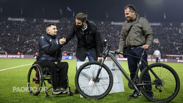 Στη διάρκεια του ημιχρόνου της αναμέτρησης, αντιπροσωπεία της ΠΑΕ ΠΑΟΚ συνοδευόμενη από στελέχη της Stoiximan, παρέδωσαν στον αγαπημένο τους αθλητή τo voucher που θα τον φέρει πιο κοντά στο ταξίδι του στο Τέξας και την καλύτερη δυνατή θεραπεία αποκατάστασης. Μάλιστα, τα χρήματα που προσέφερε η Stoiximan προέκυψαν από την πλειοδότηση του ειδικού ποδηλάτου, το οποίο πέρασε στα χέρια της Stoiximan.