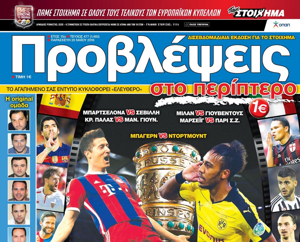Τελικοί Κυπέλλου σε Γερμανία, Ισπανία, Ιταλία, Αγγλία, Γαλλία και Πορτογαλία! Οι «ΠΡΟΒΛΕΨΕΙΣ στο περίπτερο», που κυκλοφορούν την Παρασκευή 20 Μαϊου, προσφέρουν όλη την ειδησεογραφία και τα στατιστικά για τα παιχνίδια του κουπονιού!