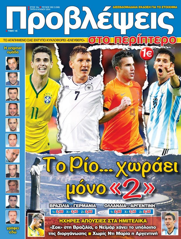 Την Τρίτη, η Βραζιλία των πέντε τροπαίων αντιμετωπίζει τη Γερμανία των τριών στο Μπέλο Οριζόντε. Υπό νορμάλ συνθήκες, η Βραζιλία θα κρατούσε ψηλά την ταμπέλα του φαβορί, αλλά ο τραυματισμός του Νεϊμάρ και η τιμωρία του Τιάγκο Σίλβα αφαιρούν από τη «σελεσάο» δύο εξαιρετικές μονάδες, δύο «πυλώνες», με τον Λουίς Φελίπε Σκολάρι να αδυνατεί προς το παρόν να εκμεταλλευτεί το εύρος του ρόστερ που κρατάει στα χέρια του, κάτι που, άλλωστε, ελάχιστες φορές κατάφερε στην καριέρα του.