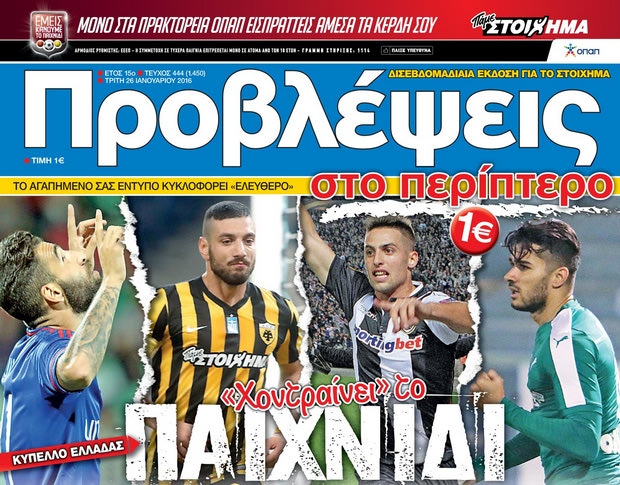 Συνέχεια με Κύπελλο Ελλάδος! Οι «ΠΡΟΒΛΕΨΕΙΣ στο περίπτερο», που κυκλοφορούν την Τρίτη 26 Ιανουαρίου, προσφέρουν όλη την ειδησεογραφία και τα στατιστικά για τα παιχνίδια του κουπονιού και ανανεώνουν το ραντεβού τους ΕΚΤΑΚΤΩΣ για την ΠΕΜΠΤΗ 28 Ιανουαρίου!