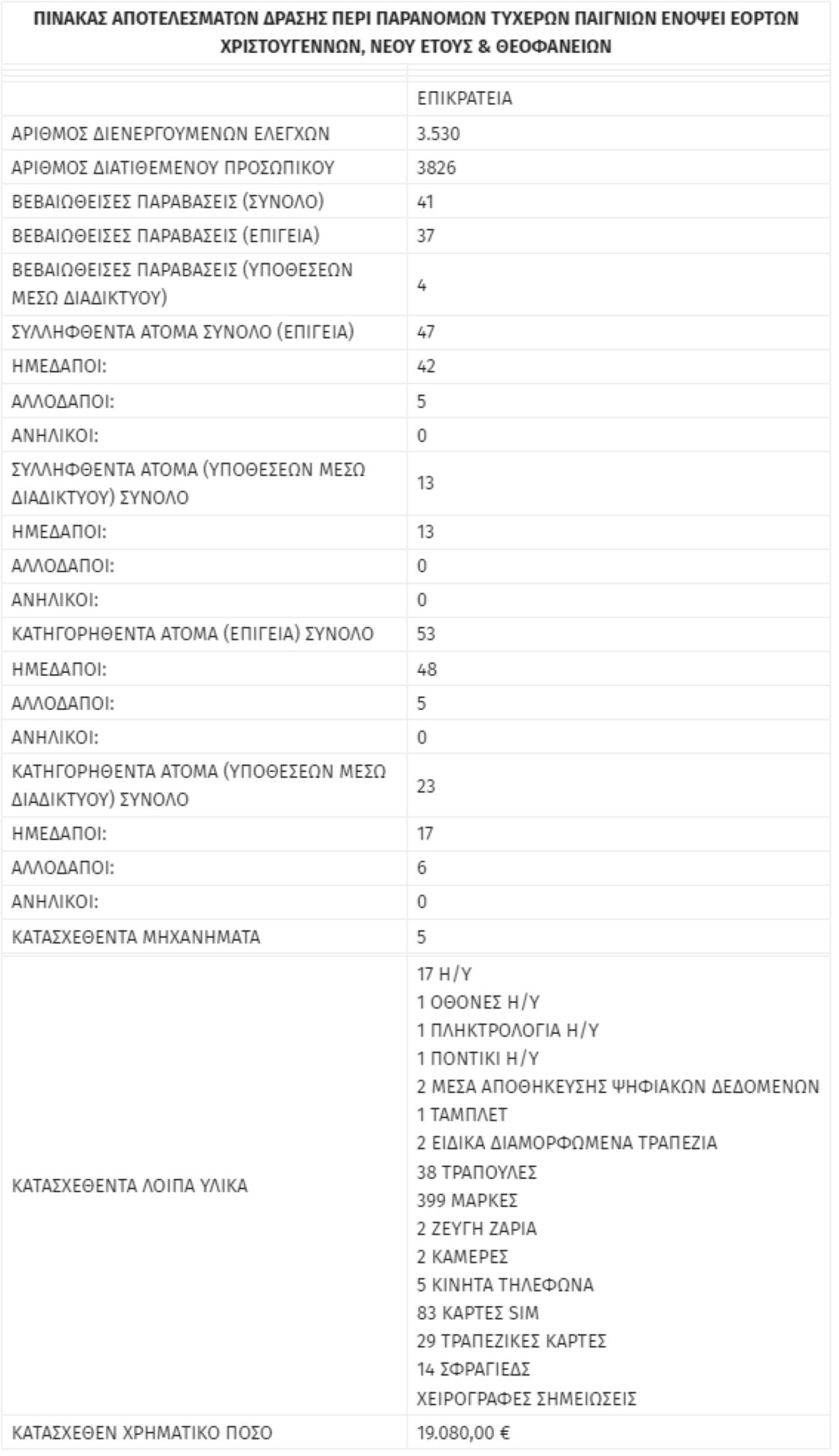 Συγκεκριμένα, από τις 16 Δεκεμβρίου 2023 έως τις 7 Ιανουαρίου 2024 διενεργήθηκαν συνολικά 3.530 έλεγχοι, εξαρθρώθηκαν 37 παράνομα μίνι καζίνο και αποκαλύφθηκαν 4 υποθέσεις συμμετοχής σε παράνομα τυχερά παιχνίδια μέσω του διαδικτύου.