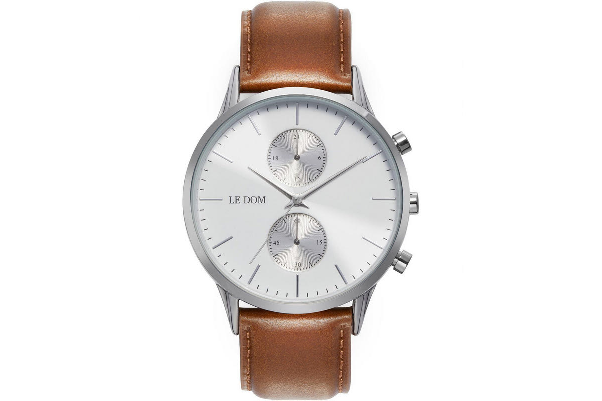 Η Le Dom δημιούργησε ένα μοντέρνο ανδρικό ρολόι με χρονογράφο. Το καντράν είναι ανάγλυφο βαμμένο σε ασημί χρώμα, με ασημί δείκτες και σημεία. Η Le Dom διάλεξε λουράκι από δέρμα υψηλής ποιότητας σε καφέ χρώμα.