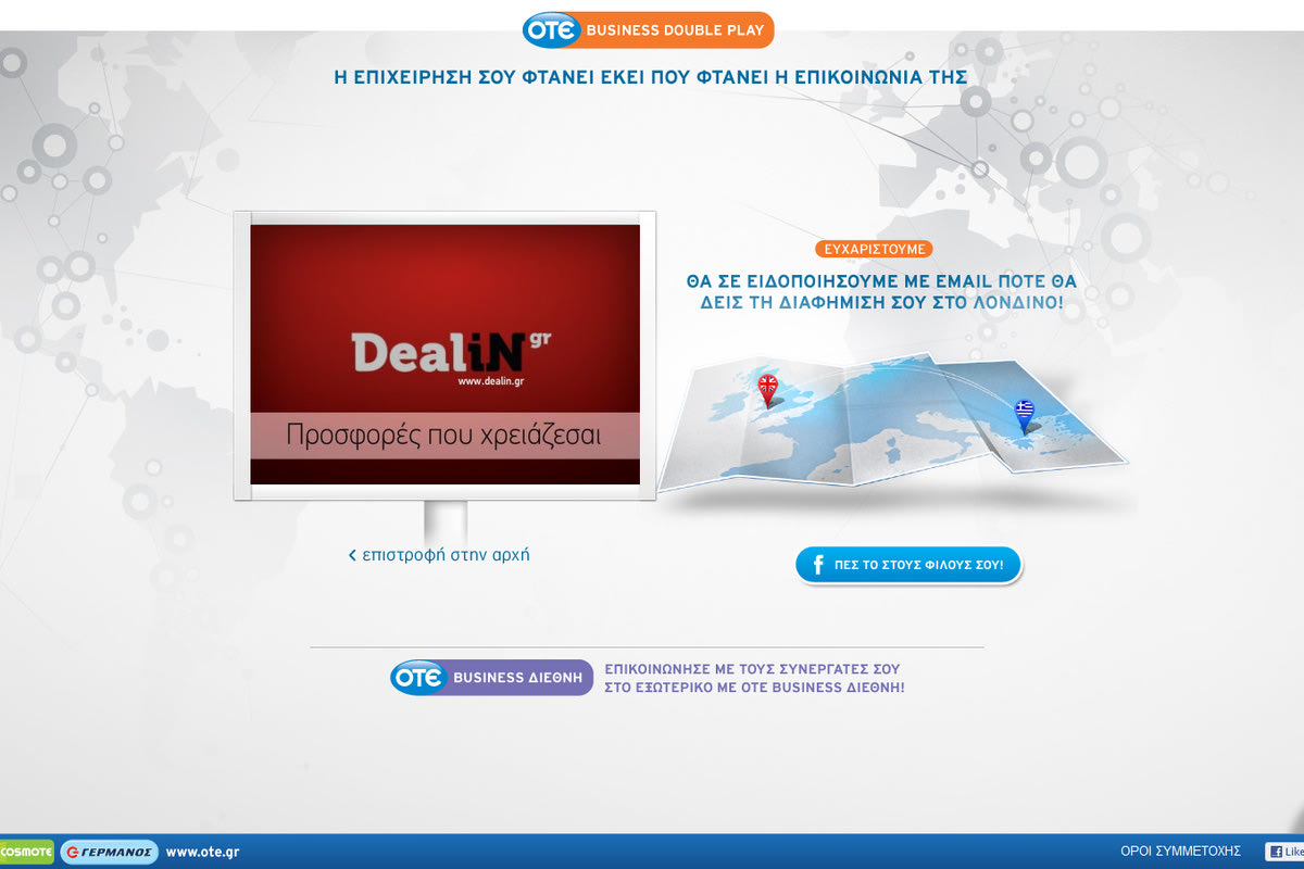 Πως τα καταφέραμε ; Μπήκαμε στη διεύθυνση www.otebusinesslive.gr, συμπληρώσαμε στον ανάλογο χώρο το λογότυπο και φωτογραφίες του DealiN και μετά από λίγο είδαμε ζωντανά τη διαφήμισή μας να προβάλλεται στην αγγλική πρωτεύουσα μέσω live streaming!