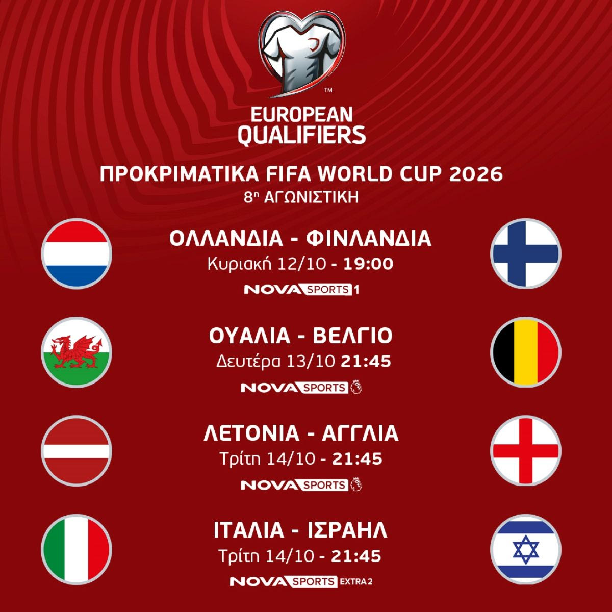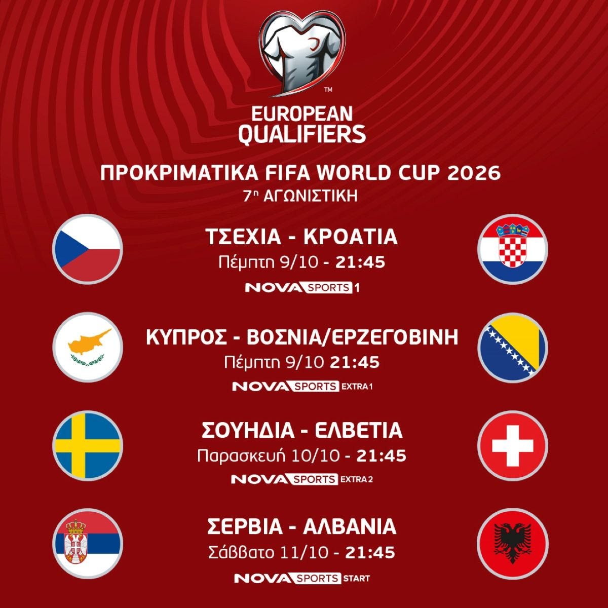 Στα κανάλια Novasports δεσπόζει η δράση στα UEFA European Qualifiers για το Μουντιάλ του 2026 και οι συνδρομητές θα έχουν την ευκαιρία να απολαύσουν όλους τους αγώνες για την 7η και 8η αγωνιστική, όπου δεσπόζουν οι αναμετρήσεις Τσεχία – Κροατία (9/10, 21:45), Πορτογαλία – Ιρλανδία (11/10, 21:45), Σερβία – Αλβανία (11/10, 21:45), Ισπανία – Γεωργία (11/10, 21:45), Ολλανδία – Φινλανδία (12/10, 19:00), Ισλανδία – Γαλλία (13/10, 21:45), Β. Ιρλανδία – Γερμανία (13/10, 21:45), Ουαλία – Βέλγιο (13/10, 21:45), Ισπανία – Βουλγαρία (14/10, 21:45), Λετονία – Αγγλία (14/10, 21:45), Ιταλία – Ισραήλ (14/10, 21:45), Πορτογαλία – Ουγγαρία (14/10, 21:45) οι οποίες θα μεταδοθούν LIVE.