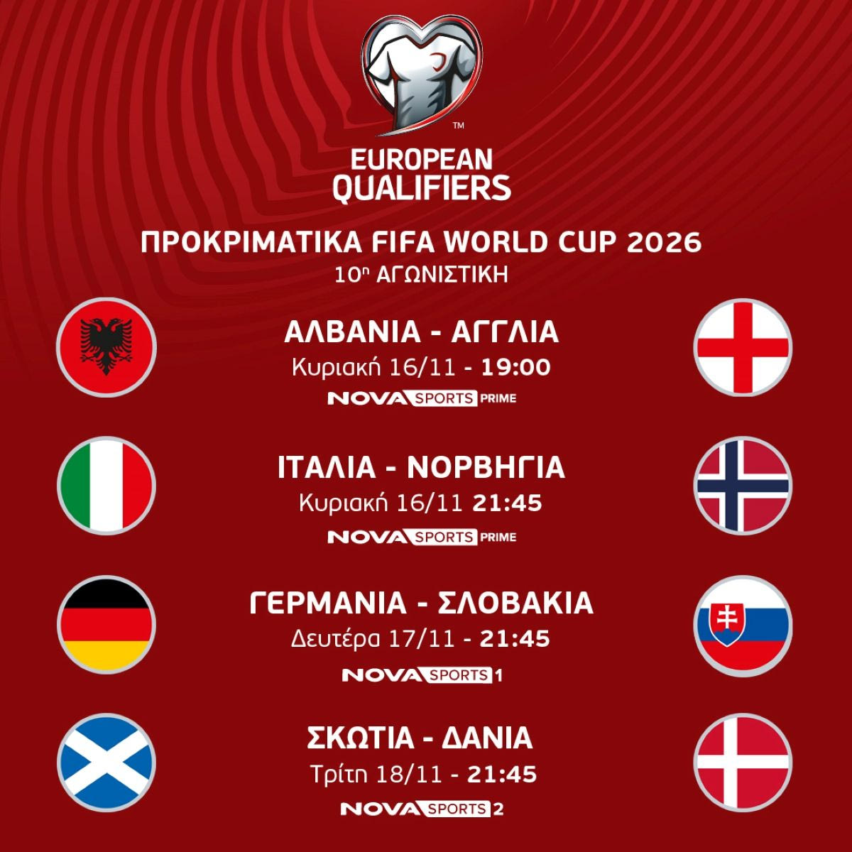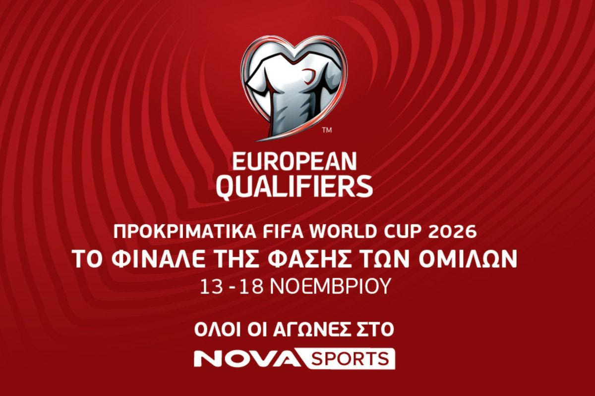 Οι ευρωπαϊκοί προκριματικοί αγώνες των εθνικών ομάδων για το Παγκόσμιο Κύπελλο του 2026 ολοκληρώνονται για τη φάση των ομίλων με τις δύο τελευταίες αγωνιστικές στο Novasports όπου περιλαμβάνονται όλοι οι αγώνες σε Live μετάδοση πλην των παιχνιδιών της Εθνικής μας, Ελλάδα – Σκωτία και Λευκορωσία – Ελλάδα, που θα μεταδοθούν σε μαγνητοσκόπηση