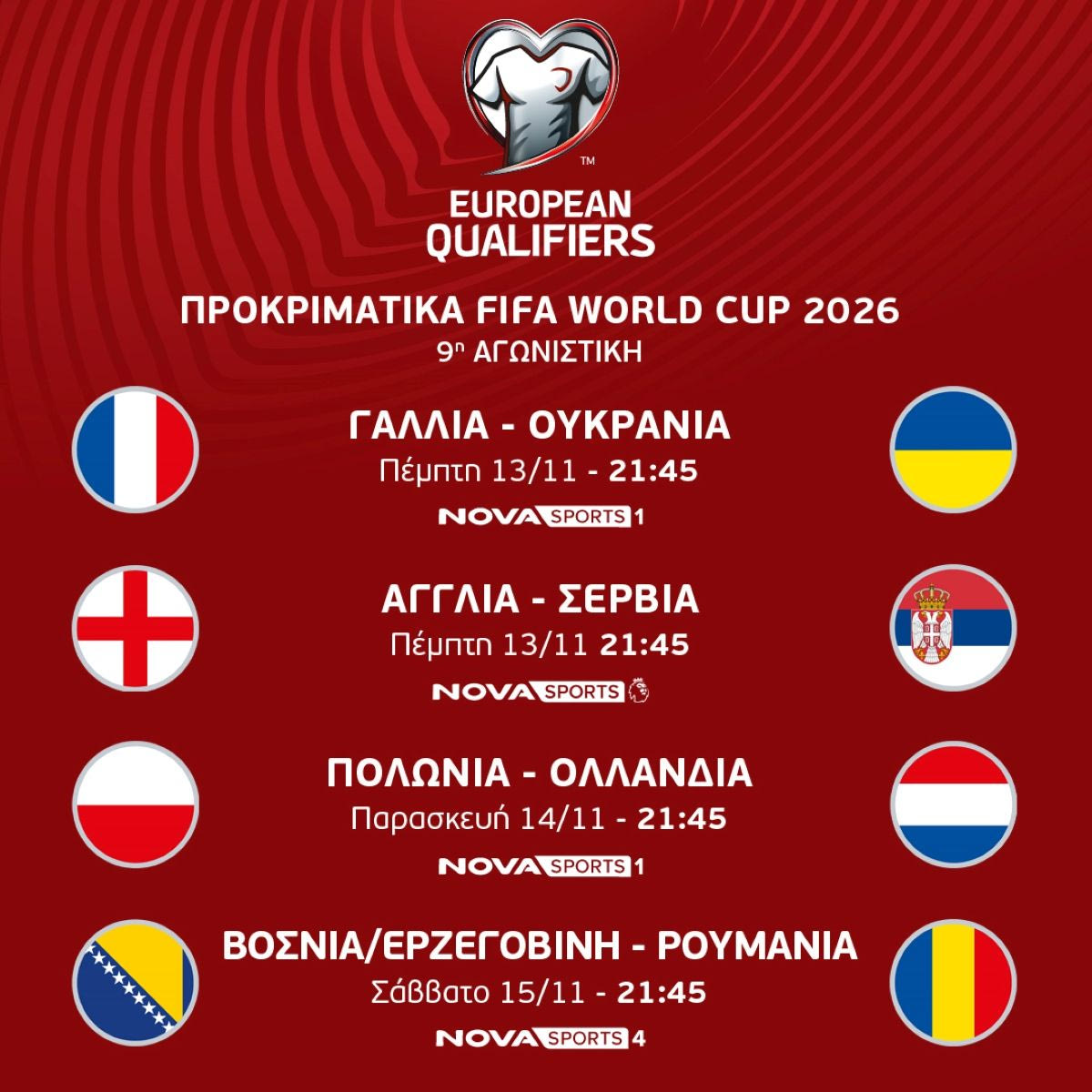 Στα κανάλια Novasports δεσπόζει η δράση στα UEFA European Qualifiers για το Μουντιάλ του 2026 και οι συνδρομητές θα έχουν την ευκαιρία να απολαύσουν όλους τους αγώνες για τις δύο τελευταίες αγωνιστικές στη φάση των ομίλων όπου δεσπόζουν οι αναμετρήσεις Γαλλία – Ουκρανία (13/11, 21:45), Αγγλία – Σερβία (13/11, 21:45), Ιρλανδία – Πορτογαλία (13/11, 21:45), Πολωνία – Ολλανδία (14/11, 21:45), Τουρκία – Βουλγαρία (15/11, 19:00), Γεωργία – Ισπανία (15/11, 19:00), Αλβανία – Αγγλία (16/11, 19:00), Ιταλία – Νορβηγία (16/11, 21:45), Γερμανία – Σλοβακία (17/11, 21:45), Σκωτία – Δανία (18/11, 21:45) οι οποίες θα μεταδοθούν LIVE.
