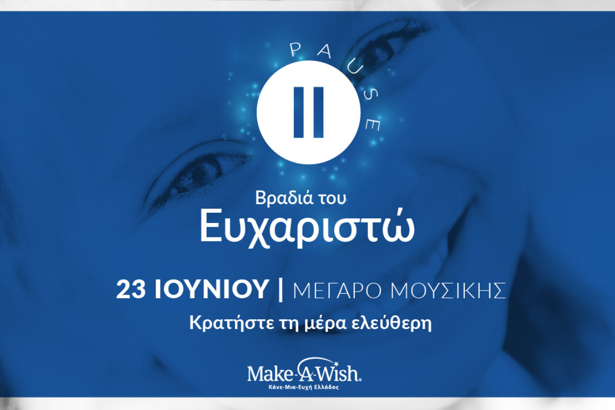 Μετά από 2,5 περίπου χρόνια, την Πέμπτη 23 Ιουνίου στο Μέγαρο Μουσικής, το Make-A-Wish (Κάνε-Μια-Ευχή Ελλάδος) επιστρέφει με μια ιδιαίτερη βραδιά, τη Βραδιά του Ευχαριστώ.