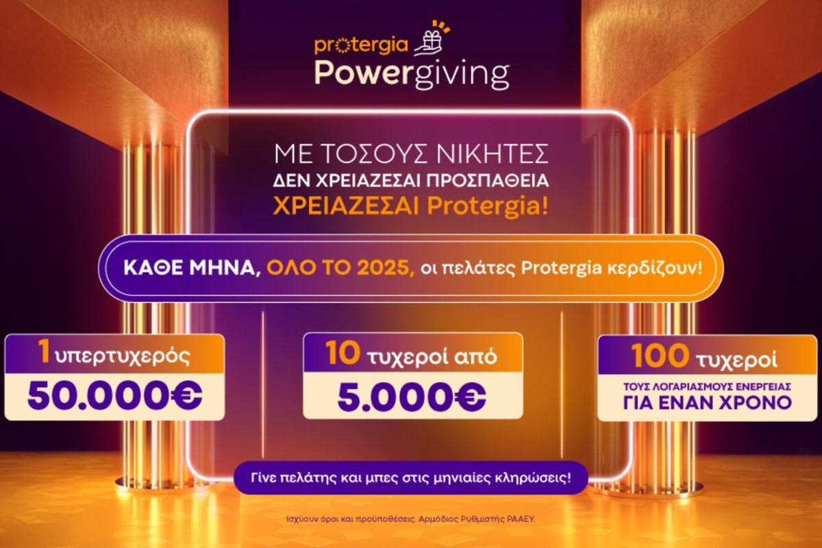 Το Powergiving της Protergia, συνεχίζεται με μηνιαίες κληρώσεις για ολόκληρο το 2025, χαρίζοντας κάθε μήνα δώρα σε 111 νικητές και προσφέροντας συνολικά περισσότερα από 1.300 έπαθλα στη διάρκεια του έτους. Οι κληρώσεις πραγματοποιούνται εντός του πρώτου δεκαημέρου κάθε μήνα και σε αυτές συμμετέχει το ενεργό πελατολόγιο της Protergia βάσει των όρων που είναι αναρτημένοι στην ιστοσελίδα protergia.gr/powergiving. Νέοι πελάτες μπορούν να συμμετέχουν επιλέγοντας την Protergia για τις ενεργειακές τους ανάγκες.