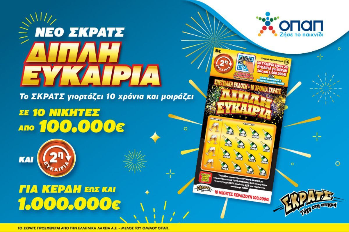 Το ΣΚΡΑΤΣ γίνεται 10 ετών και το γιορτάζει με το επετειακό παιχνίδι «Διπλή Ευκαιρία», που μοιράζει 100.000 ευρώ σε 10 νικητές, ενώ για πρώτη φορά δίνει την ευκαιρία στους παίκτες να διεκδικήσουν έως και 1.000.000 ευρώ, ακόμα και αν ο λαχνός τους δεν κερδίσει.