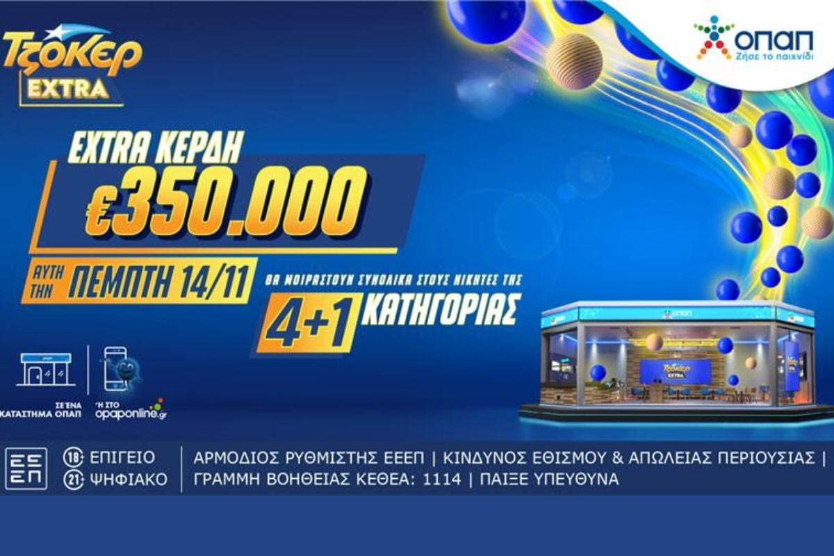 Μετά την πρεμιέρα στην κλήρωση της Τρίτης, το ΤΖΟΚΕΡ Extra συνεχίζεται αυτή την εβδομάδα, με τους παίκτες του δημοφιλούς παιχνιδιού του ΟΠΑΠ να διεκδικούν και σήμερα 350.000 ευρώ επιπλέον κέρδη στην κατηγορία 4+1.