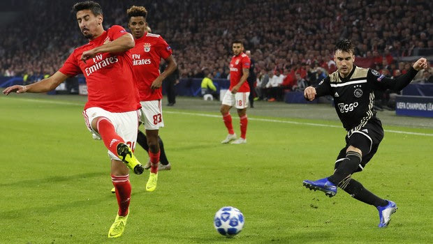 Ajax's Nicolas Tagliafico, right, passes before Benfica's Andre Almeida, left, during a Group E Champions League soccer match between Ajax and Benfica at the Johan Cruyff ArenA in Amsterdam, Netherlands, Tuesday, Oct. 23, 2018. (AP Photo/Peter Dejong)