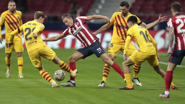 Ο Μάρκος Γιορέντε με τη φανέλα της Ατλέτικο σε μονομαχία του με τους παίκτες της Μπαρτσελόνα για την La Liga